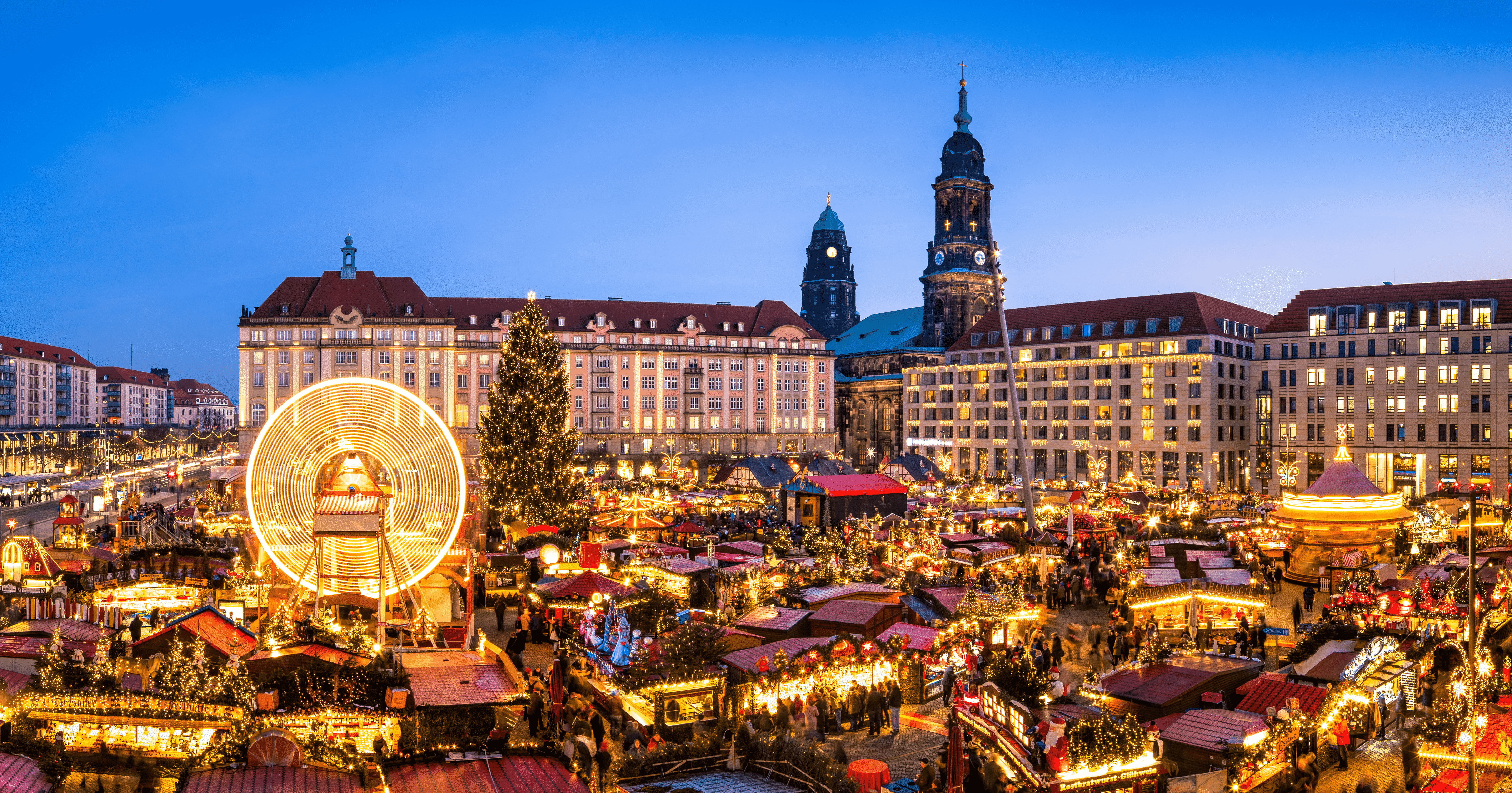 今日では、アドベントのほぼ4週間、240もの露店が出店するドレスデンのマーケットが開催されます。マーケット体験を始める際の一番の方法は、お気に入りの飲み物を持っていくことです。外は寒いでしょうから、マルド・ワイン、温かいアップルサイダー、ホットココアのいずれかを持参することをお勧めします。何を持っていくにしても、飲み物からは芳しい蒸気が立ち上がり、カップに入れれば指が温まります。次に、高さ14 mのクリスマスピラミッドに向かって歩いていきます。ピラミッドの各層には、贈り物を作る妖精たち、袋にプレゼントを詰め込むサンタ、または祝祭の音楽を奏でるミュージシャンなどのクリスマスの光景が再現されています。次にクリスマスの品々でいっぱいの屋台に向かいます。まずは、(小さめの)クリスマスピラミッドの購入を検討してください。これはキャンドルから立ち上る熱を利用し、一番上にある羽根に風を送り、回転させるものです。その他のには、手作りの装飾品が挙げられます。特に採鉱のシンボルと宗教的要素をもったドレスデンならではの伝統工芸品です。他の伝統的な物としては、シュヴィップボーゲン(文字通り半円形を意味する)があります。クリスマスのテーマによる、木製で、多くの場合、季節の光を表現するものです。最後に、素敵なくるみ割り人形とロイヒャーマン(煙出し人形)が挙げられます。手作りであることが多く、ヨーロッパ最古のマーケットでの素敵なクリスマスを思い起こさせることでしょう。買い物に明け暮れた後は、かなりお腹が空いていることでしょう!地元のジンジャーブレッド、プフラウメントッフェル(プラムの悪魔呼ばれるお菓子)や様々なローストミートがあります。